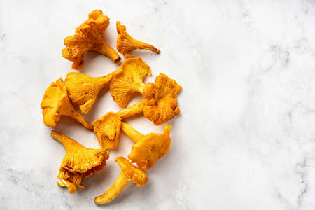 Studio shot of fresh yellow delicious wavy autumn vegetarian chanterelle mushrooms at the bottom on white background with copy space at the top