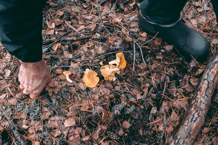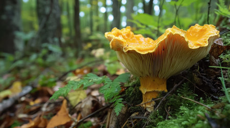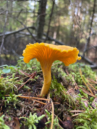 Foraged chanterelle mushroom still growing in its natural habitat, waiting to be picked.