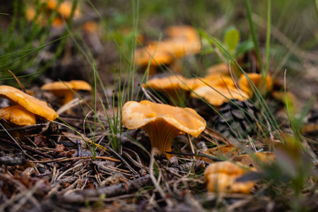 Group of wild chanterelle mushrooms growing among grass and forest debris in summer light