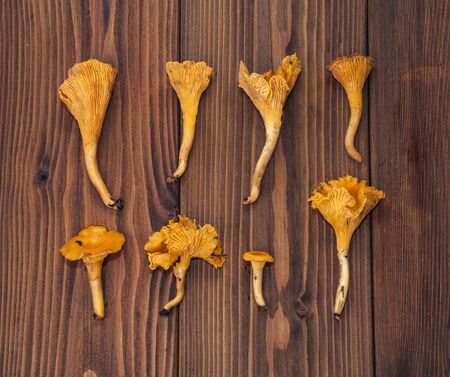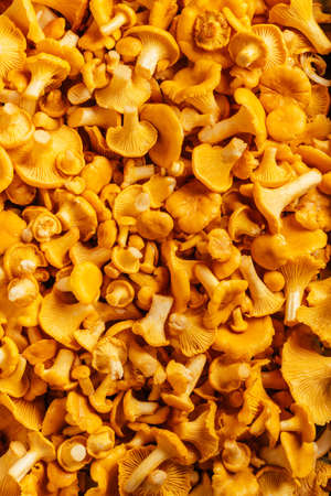 Yellow orange mushrooms juicy background delicious Cantharellus cibarius golden chanterelle with curly hats on fleshy leg. Ingredient of dish. Cooking dish. Vertical. Top view. Choice flavor fillings.