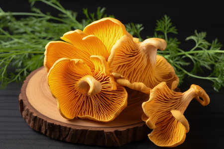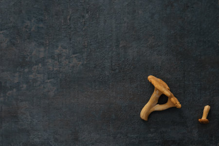 Organic wild chanterelle mushrooms on black stone background with copy space