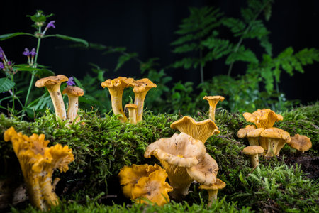 Edible mushrooms. Close up of growing chanterelle mushrooms in a forest on green background