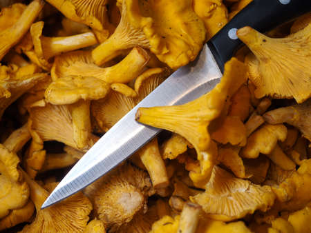 Mushroom Background. Chanterelles mushrooms just picked in the forest. Cantharellus cibarius is the golden chanterelle, the type species of the chanterelle genus Cantharellus. It is also known as girolle (or girole).