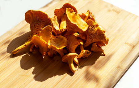 Fresh chanterelle mushrooms arranged on wooden cutting board, showcasing vibrant orange hues and intricate textures, culinary presentations and gourmet dishes, Cantharellus cibarius