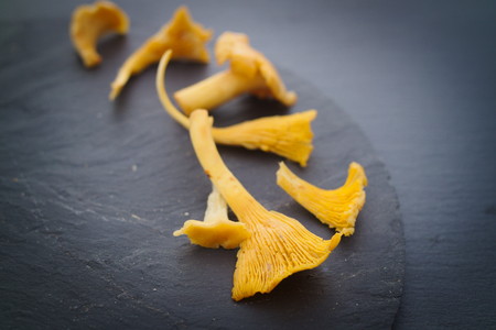 Colorful orange freshly picked chanterelle forrest mushrooms on dark stone slate surface. Selective focus.