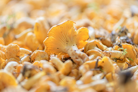 Chanterelle yellow and other delicate mushrooms. lots of mushrooms collected as background