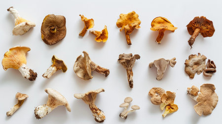 Various wild mushrooms on a white background. Concept of foraging, fungi, nature exploration, food ingredient.