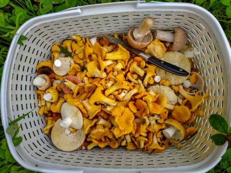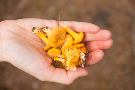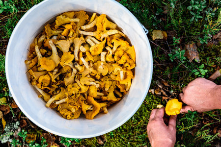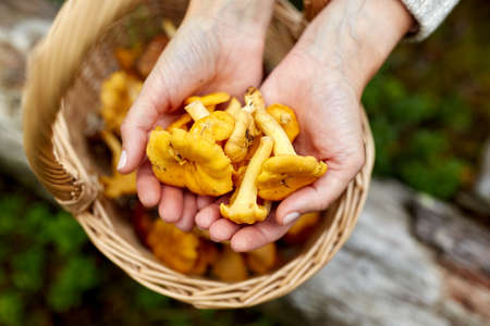 Picking wild forest yellow chanterelles mushroom harvest.
