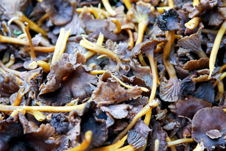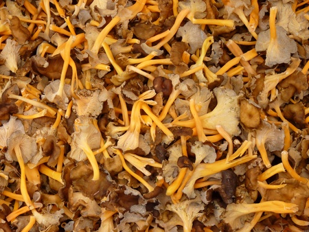 Chanterelle yellow and other delicate mushrooms. lots of mushrooms collected as background