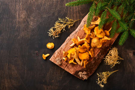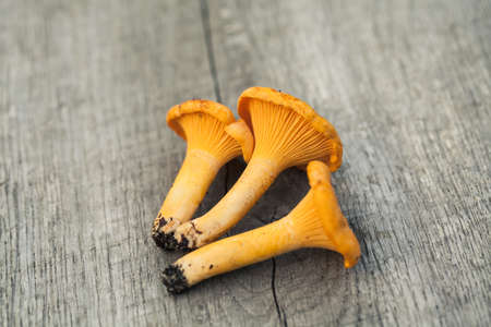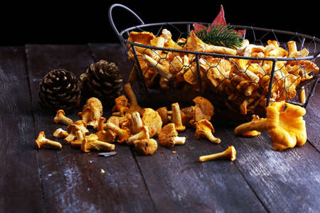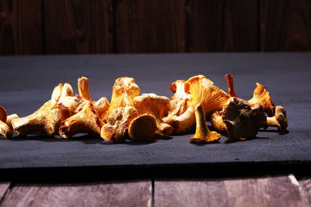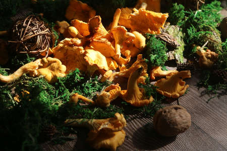 Mushrooms chanterelle on table. Raw wild mushrooms chanterelles. Composition with wild mushroom.