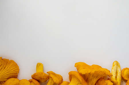 Studio shot of fresh yellow delicious wavy autumn vegetarian chanterelle mushrooms at the bottom on white background with copy space at the top