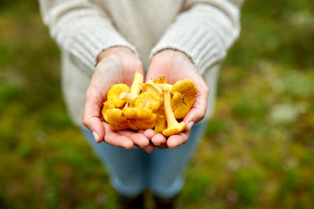 picking season, nature and forest concept - close up of young woman holding chanterelle mushrooms in hands