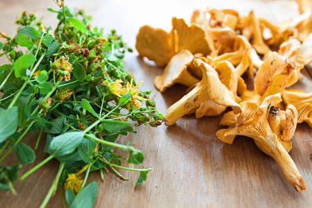 Freshly picked chanterelle mushrooms and medicinal grass of a blooming hypericum are on the table