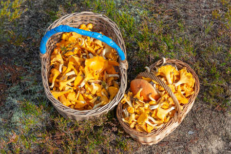 Two wicker baskets with chanterelles at the forest edge, top view