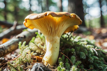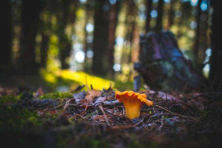Chanterelle mushroom in moss and coniferous forest. Orange golden mushrooms food in nature. Boletus growing in wild wood