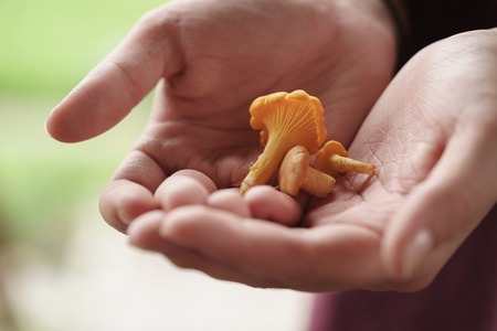 fresh chanterelle mushrooms in female teen hands, closeup photo