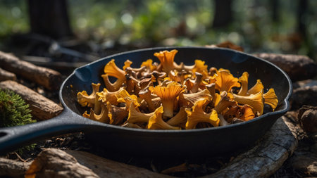 AI Generated. A cast iron skillet sizzles as foraged chanterelle mushrooms are cooked to perfection their buttery scent wafting through the cabin