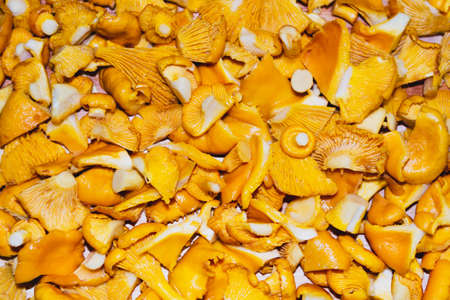 Many chanterelles mushrooms slices cut for cooking. Pattern top view. Orange organic raw forest season harvest. Diet vegan food. Rustic delicious dish recipe. Macro natural background
