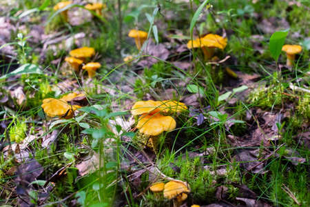 Chanterelle mushrooms growing in the forest. Selective focus