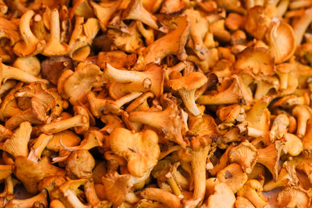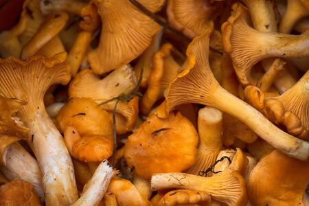 Chanterelles. A lot of chanterelle mushrooms. Texture and background of chanterelle mushrooms. Little mushrooms.