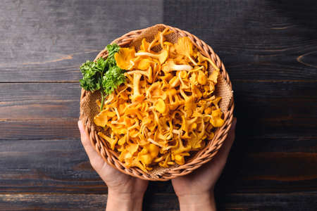Edible orange mushroom in basket with hand on wooden background, Organic food ingredients in seasonal