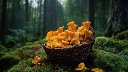 Freshly gathered chanterelle mushrooms are nestled in a woven basket on the forest floor surrounded by lush greenery and soft moss. The atmosphere is serene and tranquil.