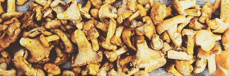 panorama of fresh chanterelles on a wooden table, after picking in the forrest