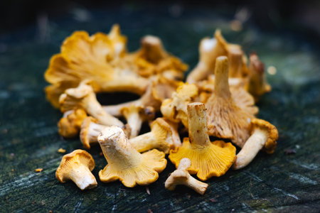 Artistic macro photo of chanterelles - cantharellus cibarius. Golden fungus or mushrooms on wooden background.