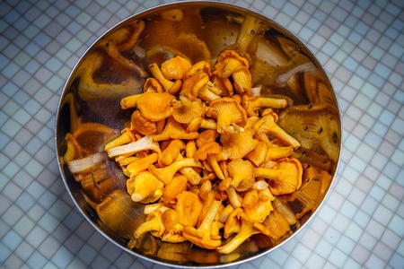 Preparing of autumn chantarelles before frying. Sweden