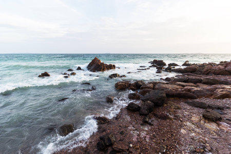 Travel in nature at a beach and tropical sea with blue sky and have a reef and rock beach with oyster shell