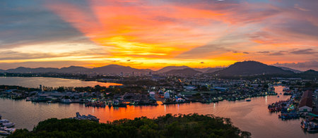 Aerial view of A amazing panoramic view of colorful sky over a large fishing port in Phuket. This port is important as a center for large fishing boats. A stunning sunset sky reflected on the water