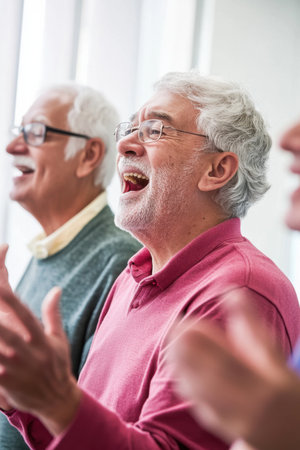 In a vibrant room filled with natural light, a group of elderly individuals participates in a joyful singing session. Guided by a passionate instructor, they express themselves freely, their faces radiating warmth and excitement. Each participant is enveloped in the music, showcasing their love for singing and the camaraderie formed through this cheerful activity. The atmosphere is lively, highlighting the profound connection art can foster among people of all ages.