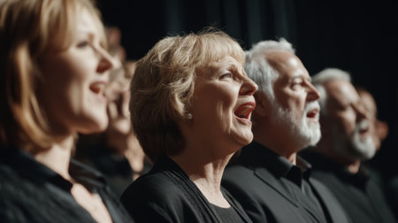A wide-angle shot of a choir singing together, their voices united in harmony with the soft focus on their facial expressions and musical gestures