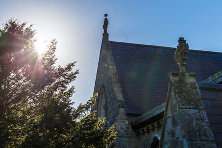 Stone chapel at sunset with ancient graveyard and cross tombstones