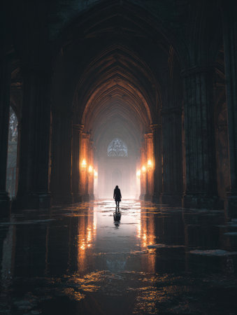A solitary figure walks through a grand archway illuminated by soft lights, evoking deep emotions in an atmospheric, reflective setting at dusk.