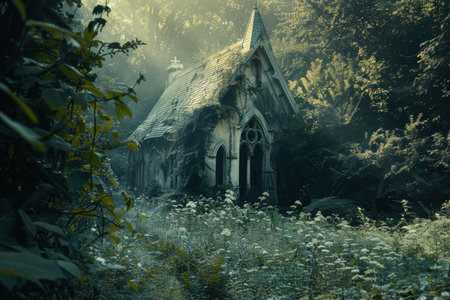 Mystical old chapel in a foggy forest clearing at daybreak