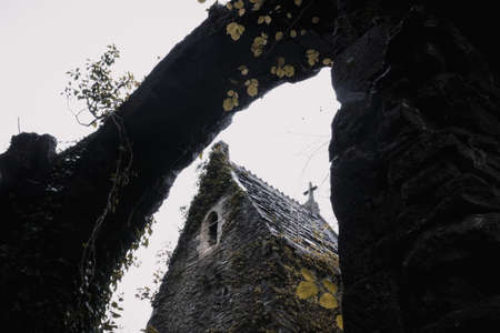 A spooky edit. Looking up at a roof of an eerie ruined church tower, Wales, UK