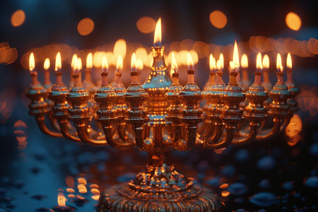 Beautifully Illuminated Menorah Surrounded by Bokeh Effects During Evening Celebration of Hanukkah