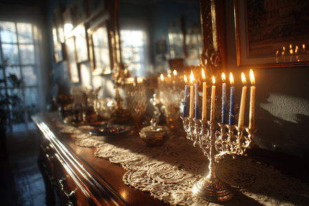 A stunning menorah with glowing candles illuminates a cozy room during Hanukkah. Surrounded by festive decorations, this scene captures the warmth and joy of this special celebration.