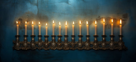 A beautifully ornate menorah stands with flickering candles, casting warm light in a dimly lit environment, evoking a sense of tradition and celebration.