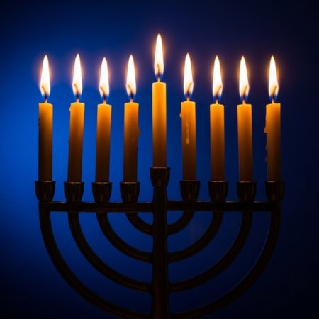 A stunning menorah with glowing candles illuminates a cozy room during Hanukkah. Surrounded by festive decorations, this scene captures the warmth and joy of this special celebration.