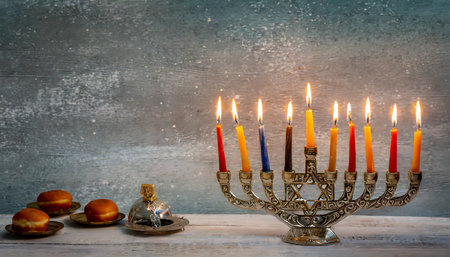Image of jewish holiday Hanukkah with menorah (traditional Candelabra) and wooden dreidel (spinning top)