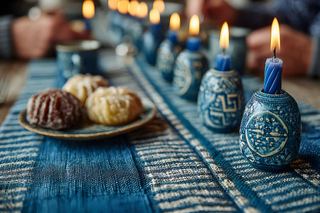 A festive dinner table set for Hanukkah with a litorah, sufganiyot, and dreidels. Evokes a warm, traditional family gathering. For holiday greetings or cultural content.