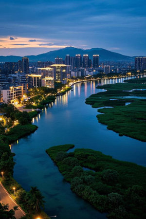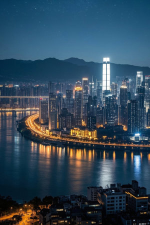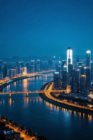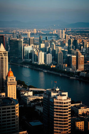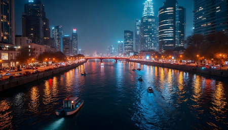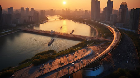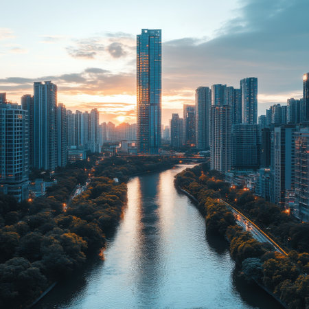 amazing a city skyline with a a cityscape featuring a towering skyscraper a bustling street and a serene river flowing through it png