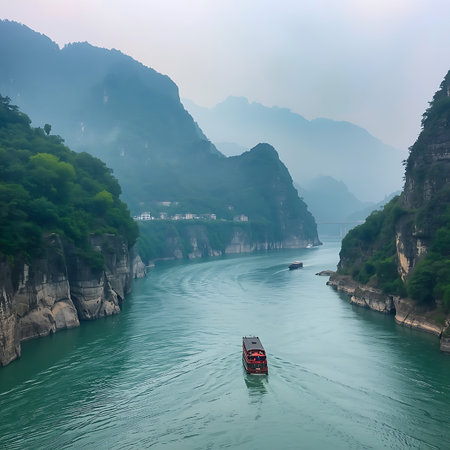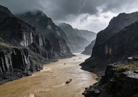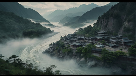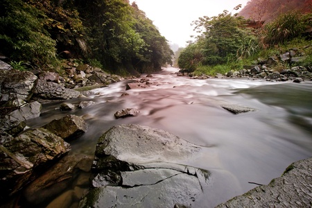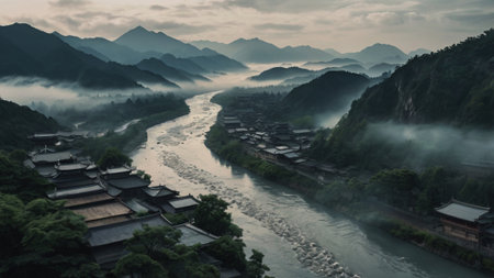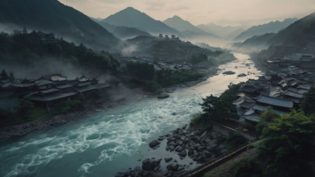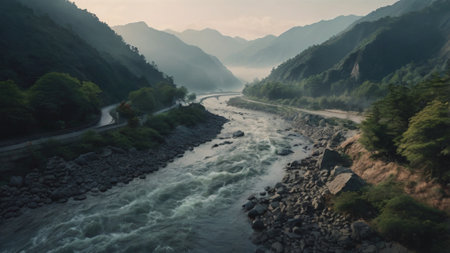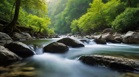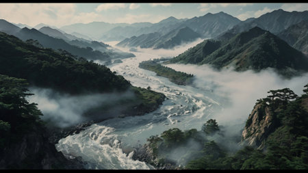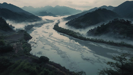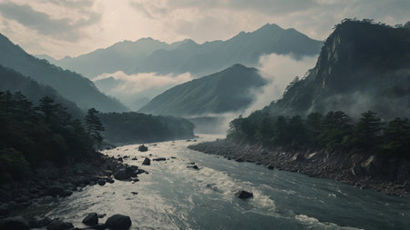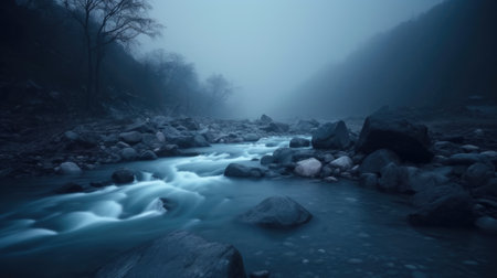 River in the misty mountains. Long exposure. Toned.. AI Generated.