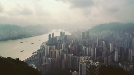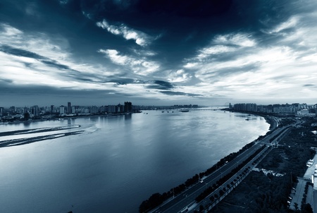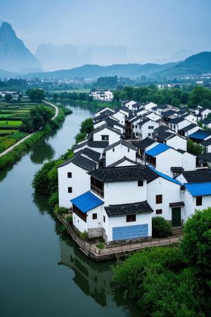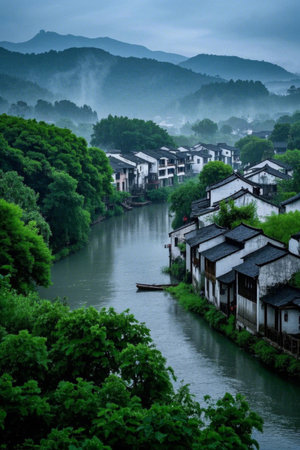 aerial view of beautiful fuchun river after rain, hangzhou city, zhejiang province, China