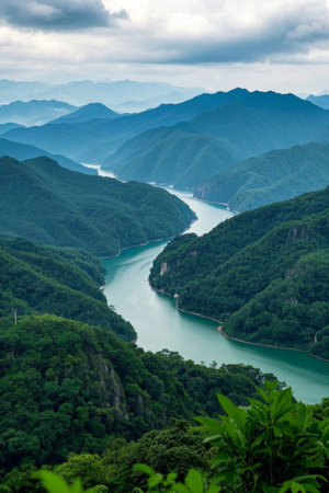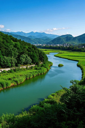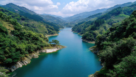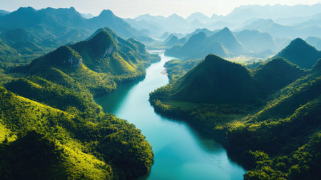 Capture the breathtaking beauty of a serene river winding through lush green mountains. This aerial view showcases vibrant nature and tranquil landscapes.