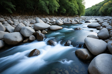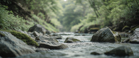 AI Generated. Crossing tranquil waters rocky river pathways serene stream nature exploration lush greenery ground level adventure and relaxation