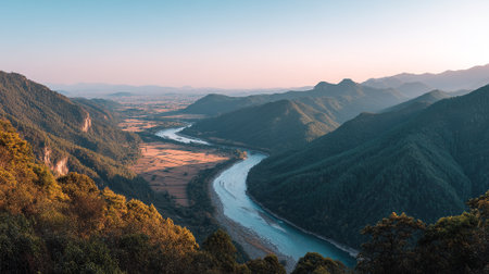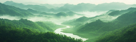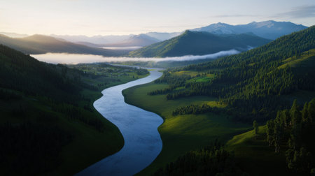 A winding river flows through a lush valley surrounded by mountains and fog at dawn. The soft light illuminates the greenery and brings a peaceful atmosphere to the scene.