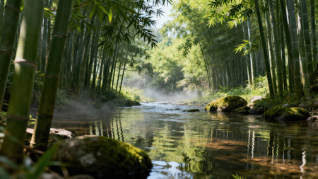 Pristine clear water of a shallow stream flowing gently through a dense, tall bamboo grove, featuring moss-covered rocks and shafts of sunlight piercing the rising mist.